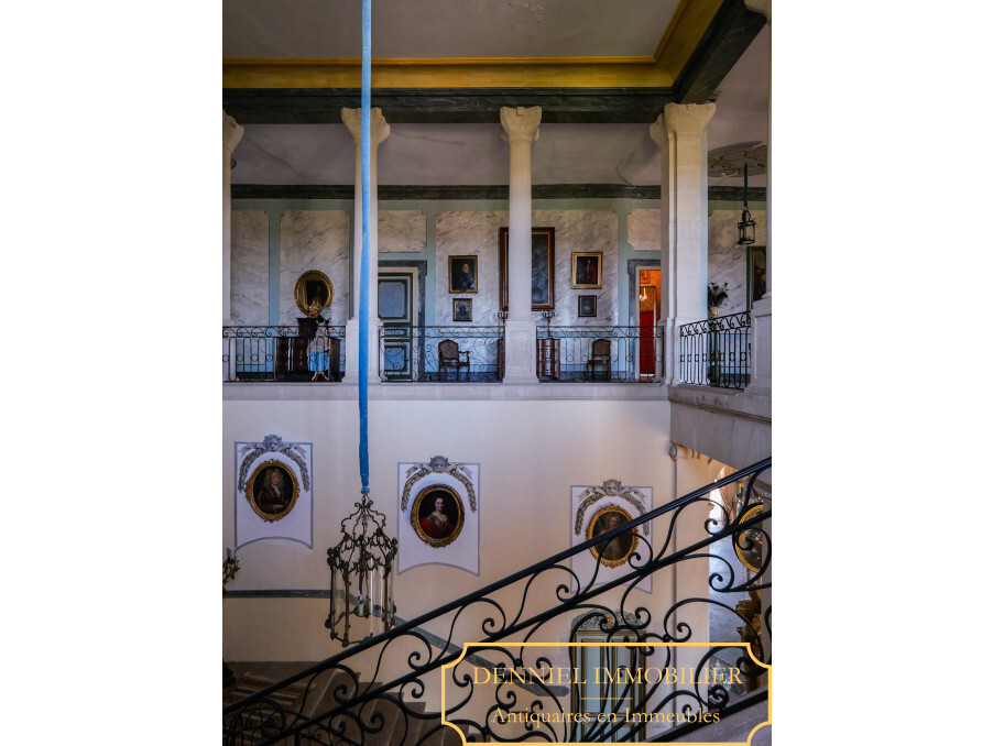 À l'intérieur, sous 5,3 mètres de plafond, baigné de lumière de toute part, le hall traversant ouvre sur le grand salon de 80 m². Il est orné de pilastres sommés de chapiteaux ioniques auxquels répondent des colonnes monumentales en ronde-bosse ouvrant sur le majestueux escalier, complètement ouvert par sa grande volée de marches menant à l'étage, peuplé de colonnes formant des balcons plongeant sur le hall de la façon la plus théâtrale. C'est assurément un des plus beaux escaliers XVIIIème privés de France.