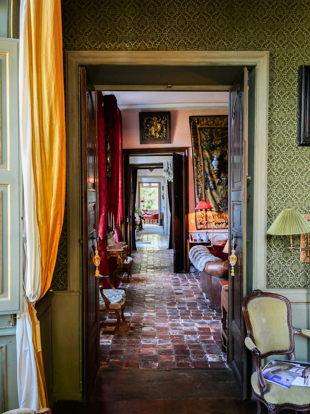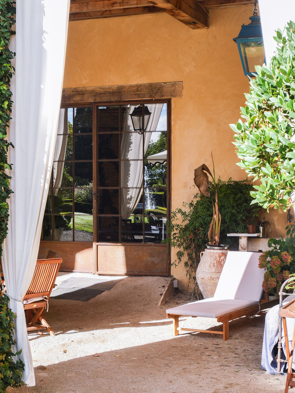 L'allée centrale en « calade » typique du Sud de la France traverse les broderies de buis et topiaires dans une atmosphère féérique et raffinée, conduisant au grand perron du majestueux avant-corps central puis vers le hall d'entrée au sol de pierre particulièrement authentique ouvert dans toutes les directions sur les enfilades de salons baignés de lumières à travers les grandes fenêtres à petits carreaux par une double exposition. La grande salle à manger est ouverte plein sud sur le village face à l'église par un grand perron vers un parterre de broderie de buis séparé du village par une douve.